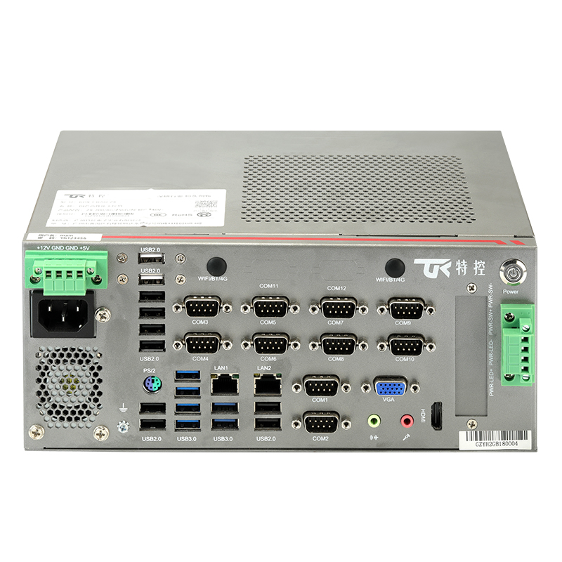 接口豐富 : 2*LAN, 10*COM, 20*USB, 1*PS/2, 1*遠 程 開 關 , 1*4PIN鳳 凰 端 子 供 電 , 1*VGA, 1*HDMI, 1*4PIN 遠程開關1*SIM槽 , 1*LINE OUT, 1*MIC, 2*2.5寸 硬 盤 位 , 1*M.2( 2230, PCIE+USB2信 號 , 支 持 1*4PIN 鳳凰端子供電(+12V/+5V)WiFi/BT/4G),1*PCIE X16